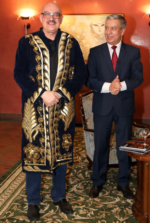 Кстати, и сам Сталик Ханкишиев в этот вечер без подарка не ушел - посол Бахром Ашрафханов одарил его красиво расшитым национальным узбекским халатом.