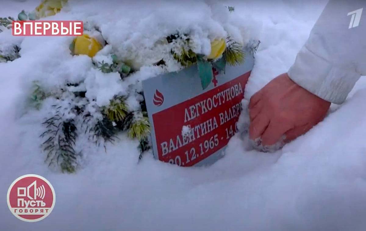 Судя по кадрам, могила Легкоступовой очень скромная. Обычный деревянный крест, фото в рамке и цветы, один из букетов принес Фирсов. Снег в этой части кладбища чистят не так усердно, как на «аллее звезд», поэтому могила почти полностью была засыпана, в какой-то момент Фирсов даже попытался расчистить ее руками. Тем не менее выглядит последнее пристанище Валентины Легкоступовой очень достойно.