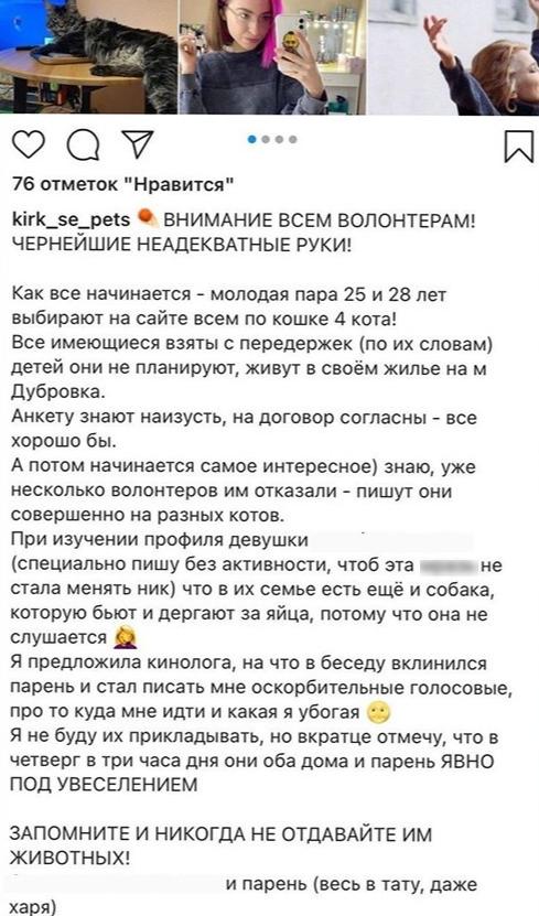 «В их семье есть еще и собака, которую бьют и дергают за яйца, потому что она не слушается. Я предложила кинолога, на что в беседу вклинился парень и стал писать мне оскорбительные голосовые про то, куда мне идти и какая я убогая», — возмутилась зоозащитница.