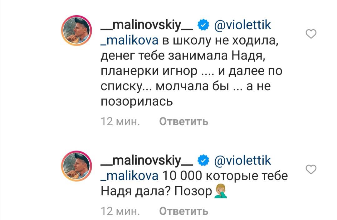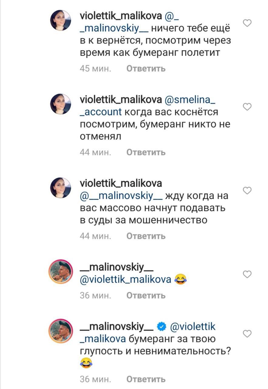 Страницы певца в соцсетях пестрят положительными отзывами, поклонники и партнеры благодарят Алекса за их спасение из нищеты. И ни одного негативного высказывания. Но, как оказалось, не все из ставших партнерами Малиновского счастливы, а комментарии с негативными комментариями певец просто удаляет. Нам удалось «поймать» жаркий спор между Малиновским и потерявшей деньги на его платформе девушкой.