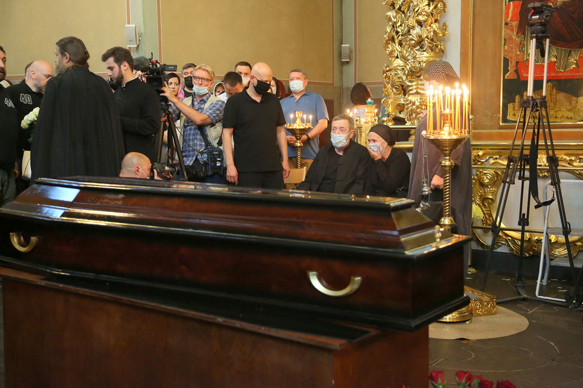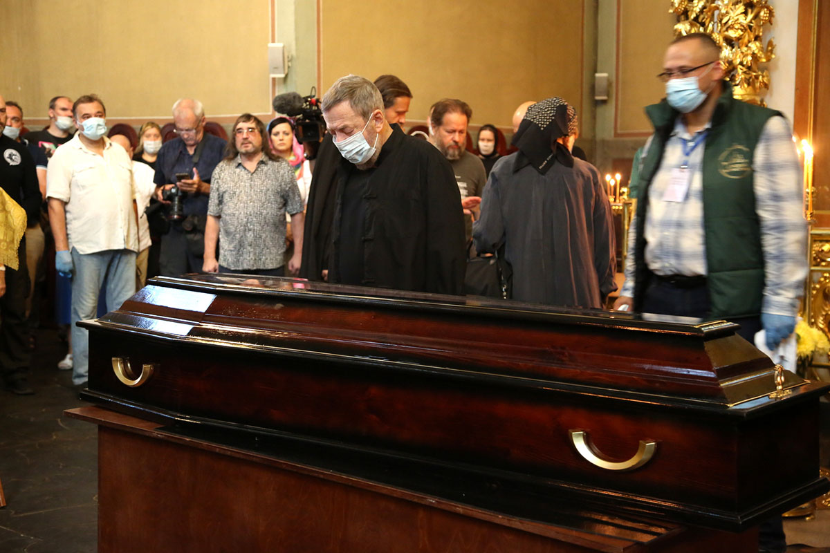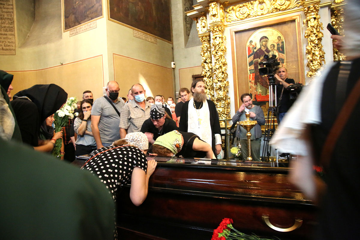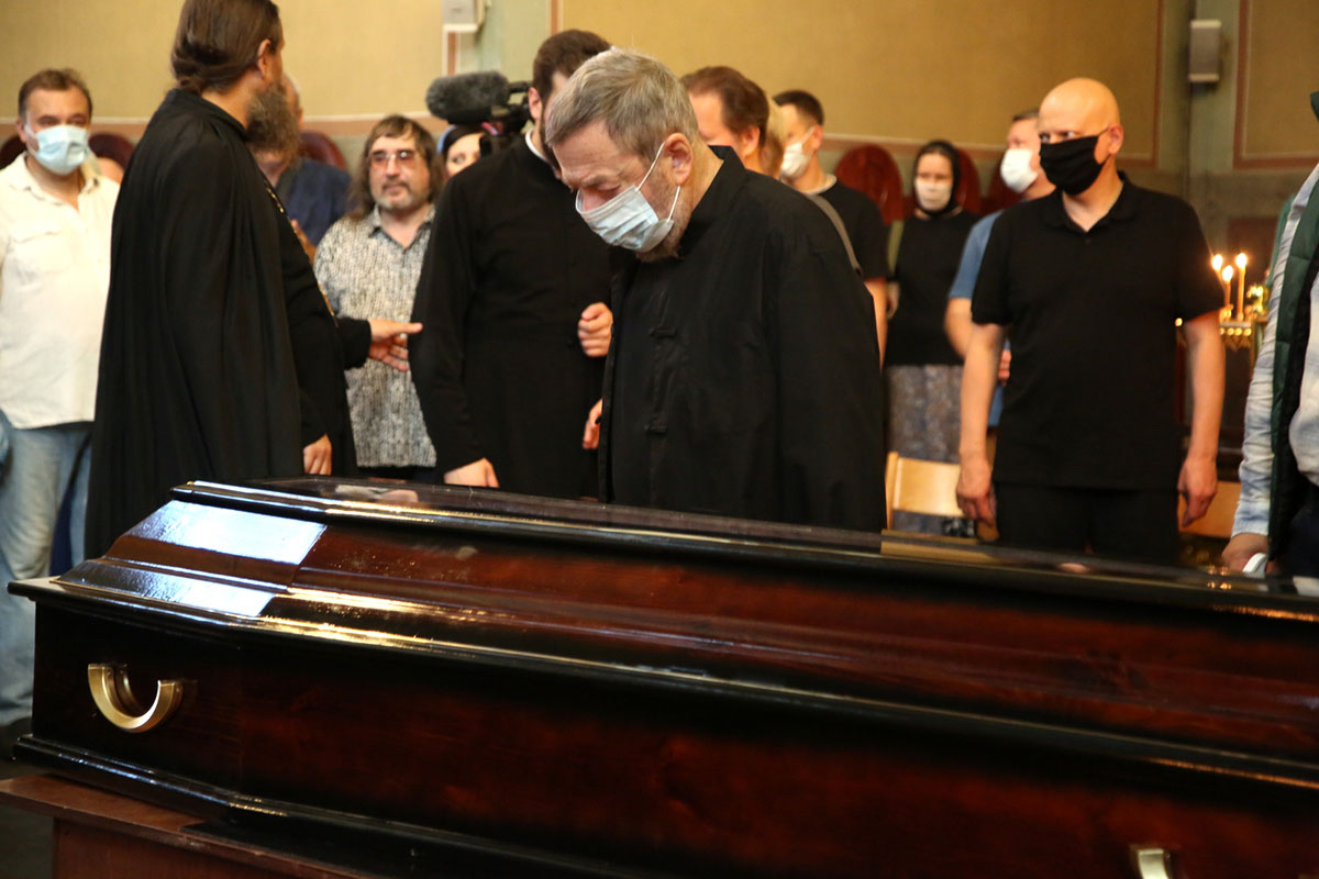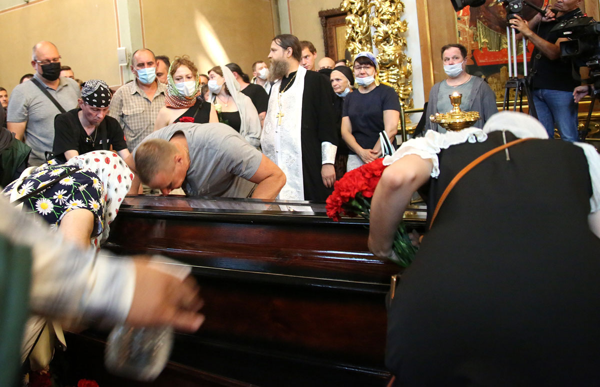 После чина отпевания к гробу выстроилась очередь. Люди подходили и, не боясь эпидемии, целовали крышку домовины,. Правда, распорядитель траурной церемонии то и дело протирал крышку антисептиком.