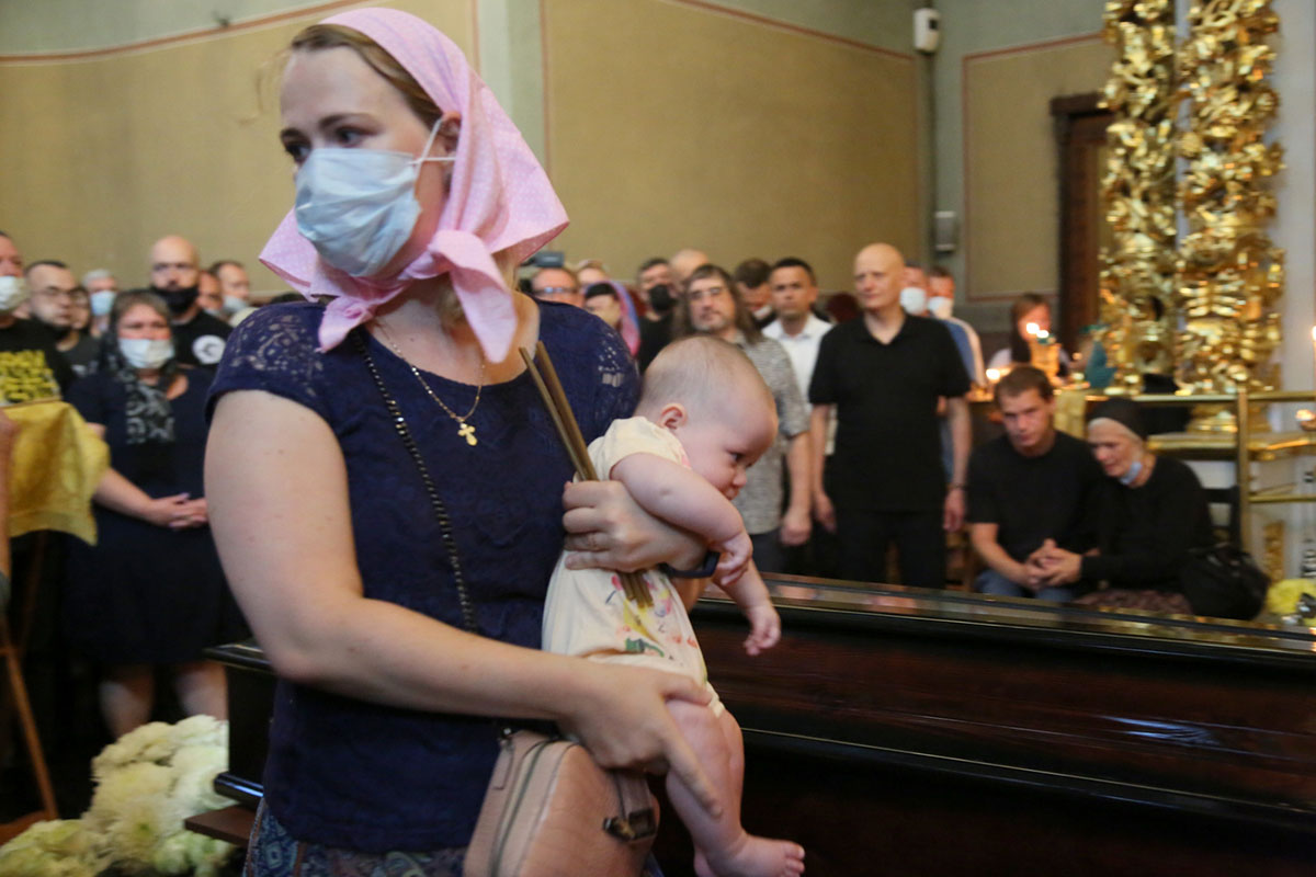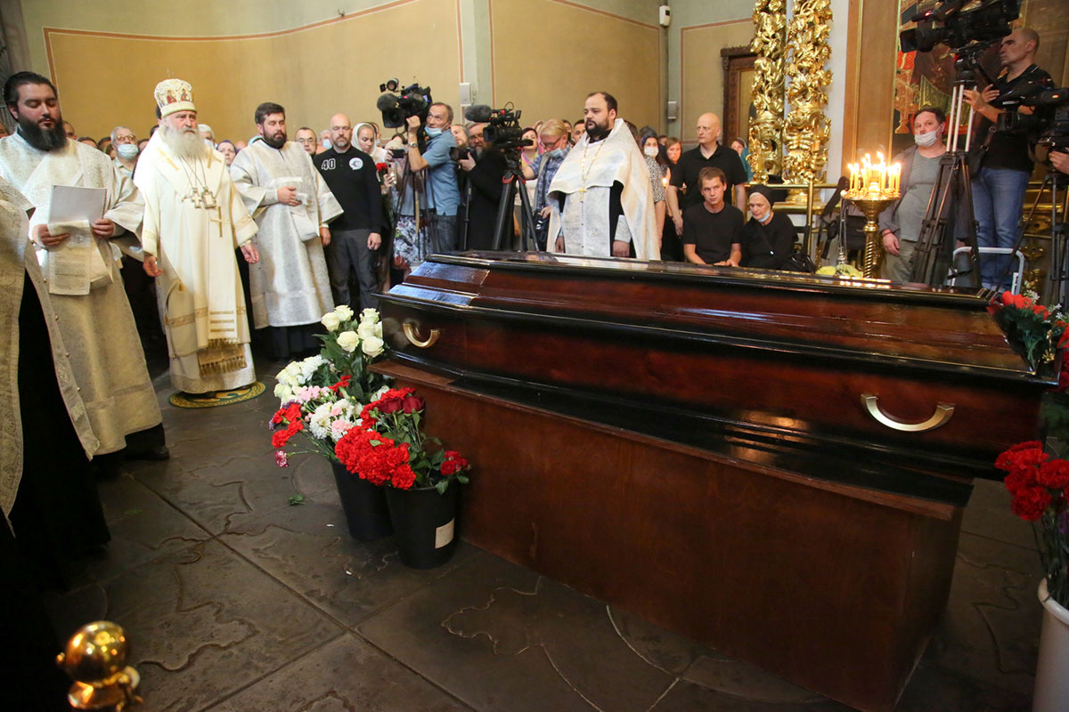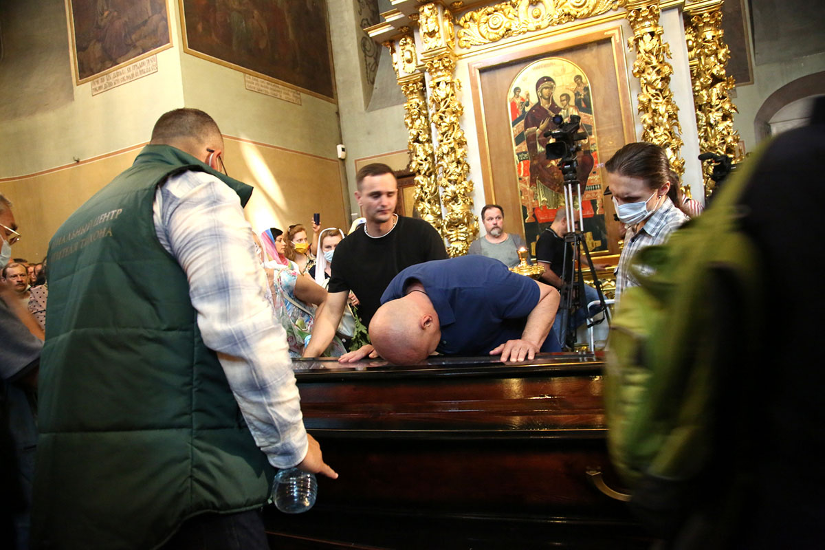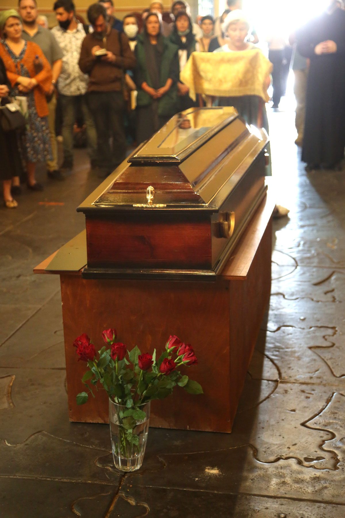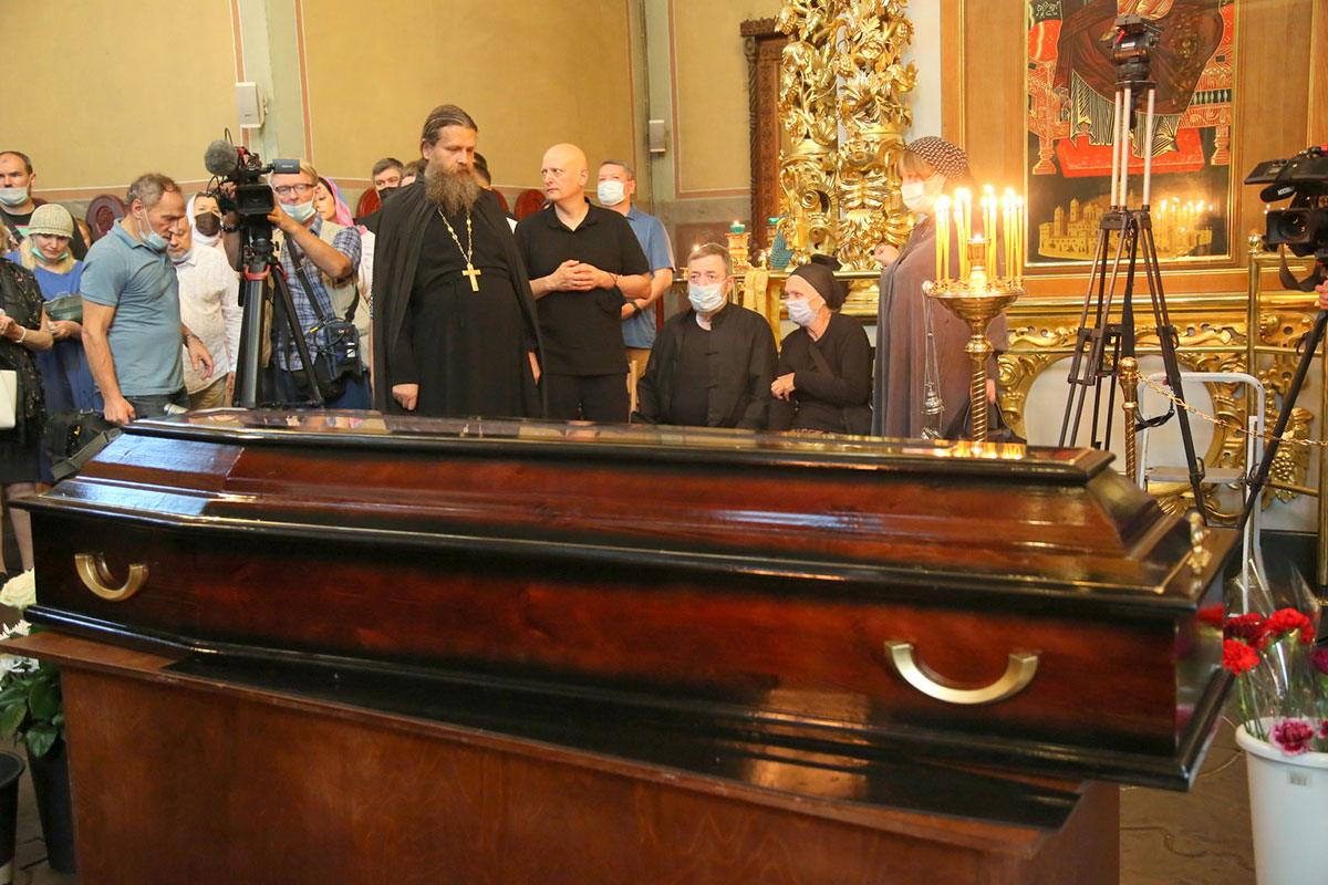 После чина отпевания к гробу выстроилась очередь. Люди подходили и, не боясь эпидемии, целовали крышку домовины,. Правда, распорядитель траурной церемонии то и дело протирал крышку антисептиком.