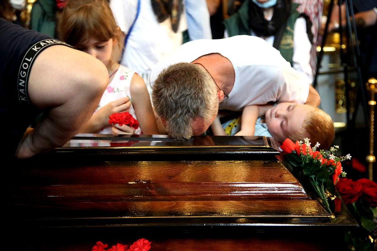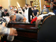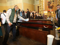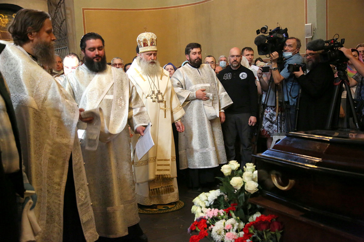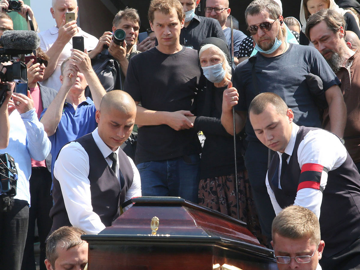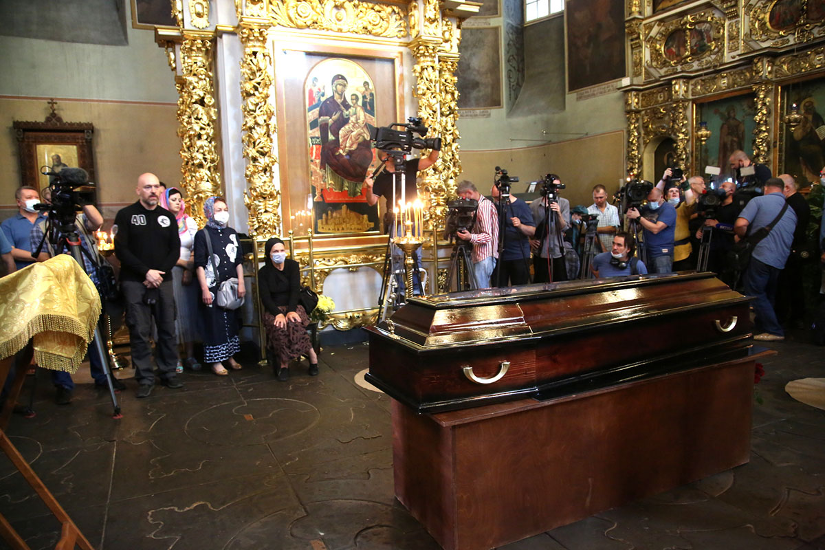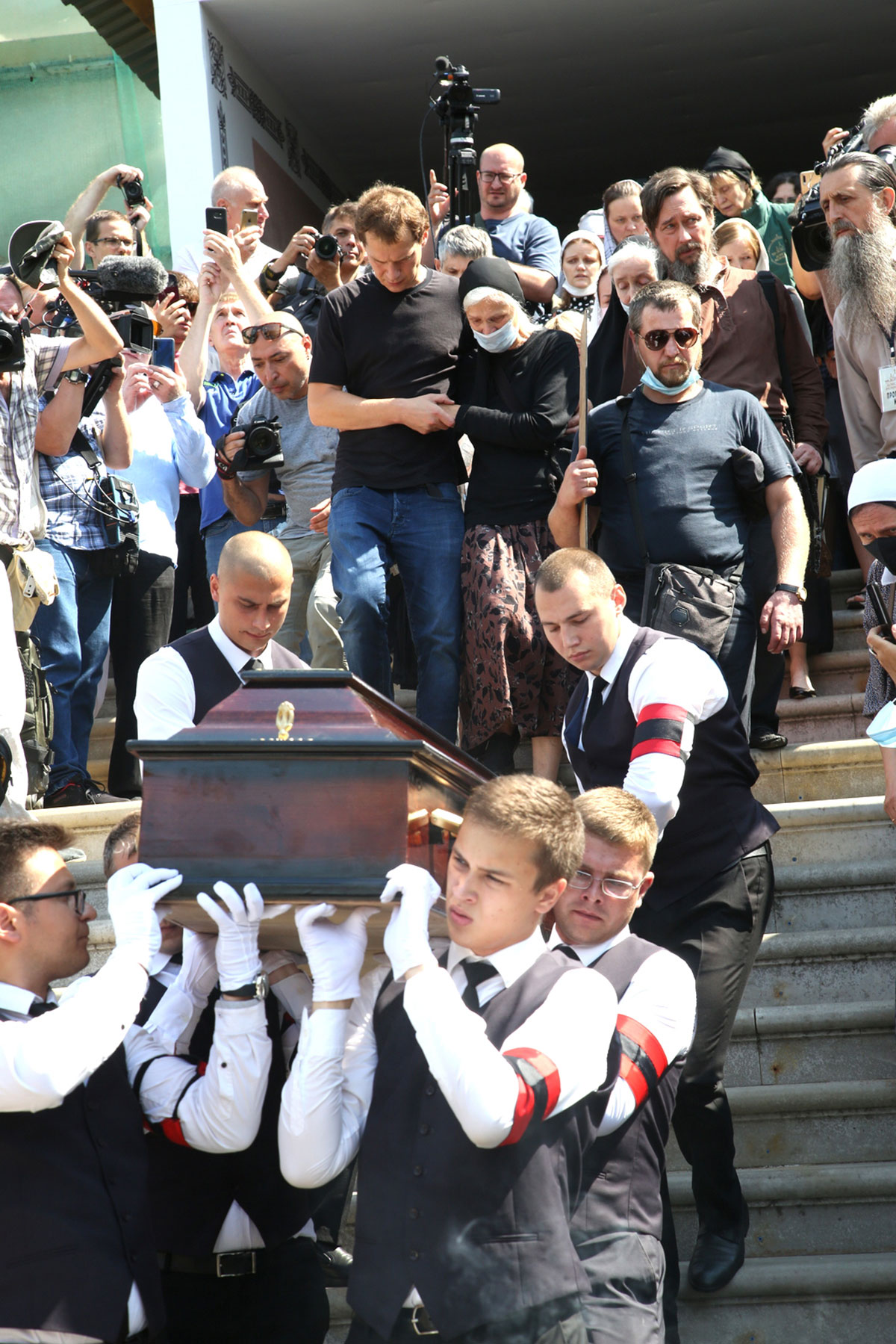 После чина отпевания к гробу выстроилась очередь. Люди подходили и, не боясь эпидемии, целовали крышку домовины,. Правда, распорядитель траурной церемонии то и дело протирал крышку антисептиком.