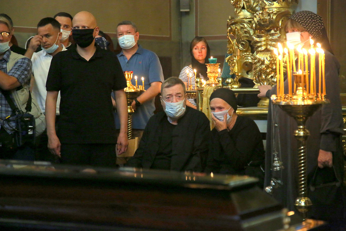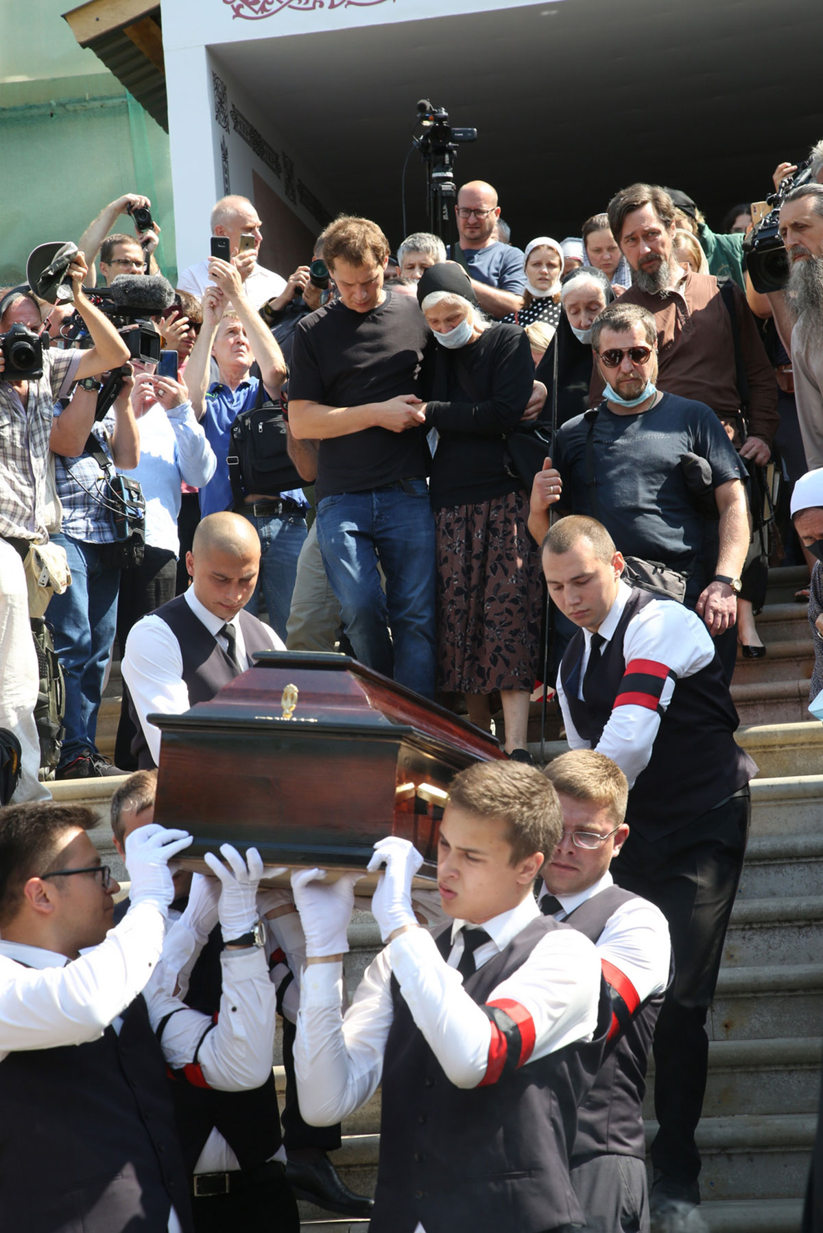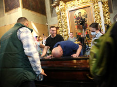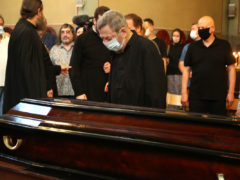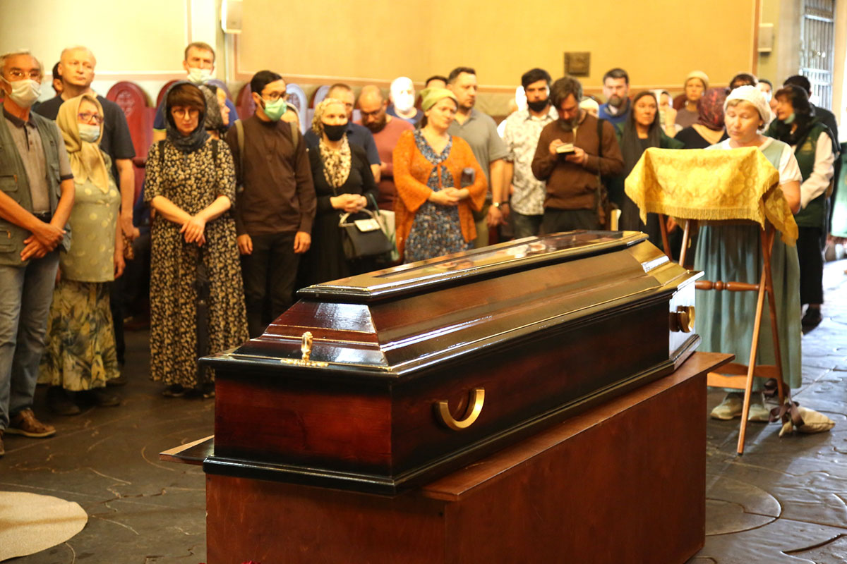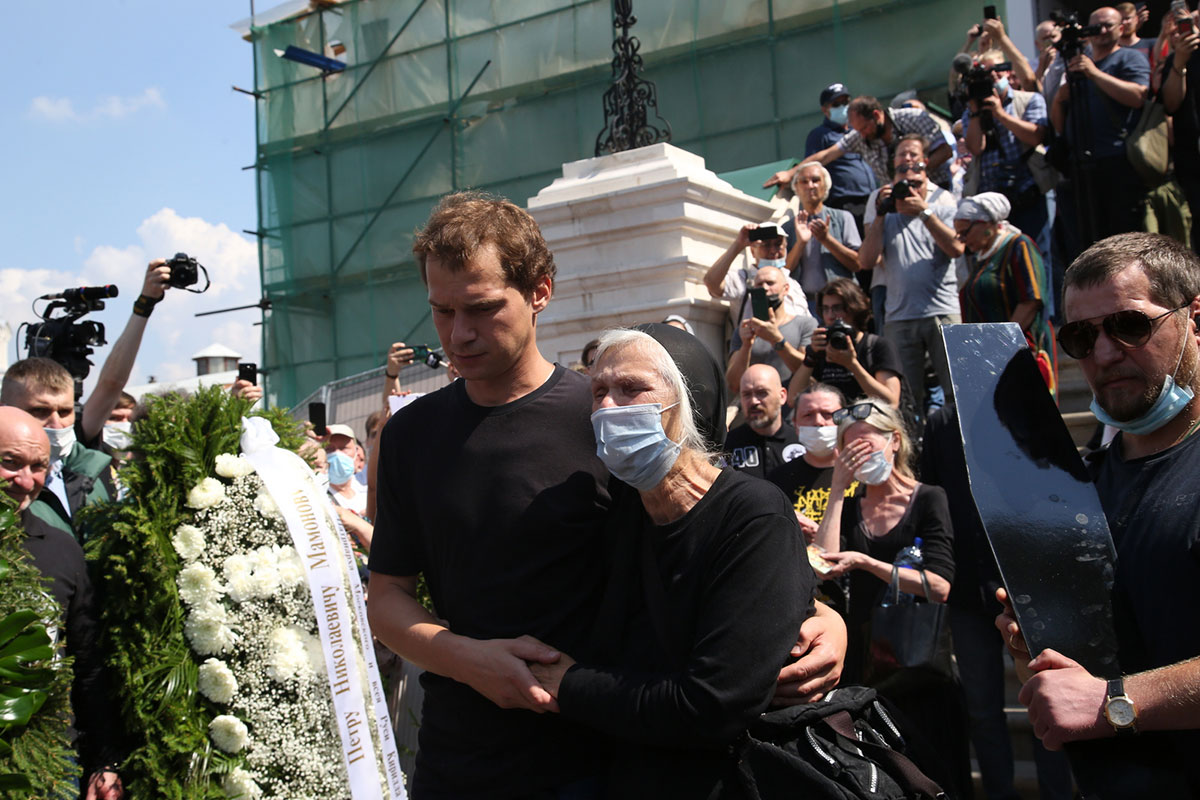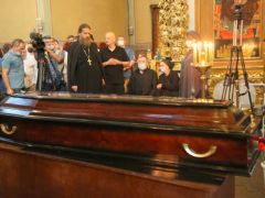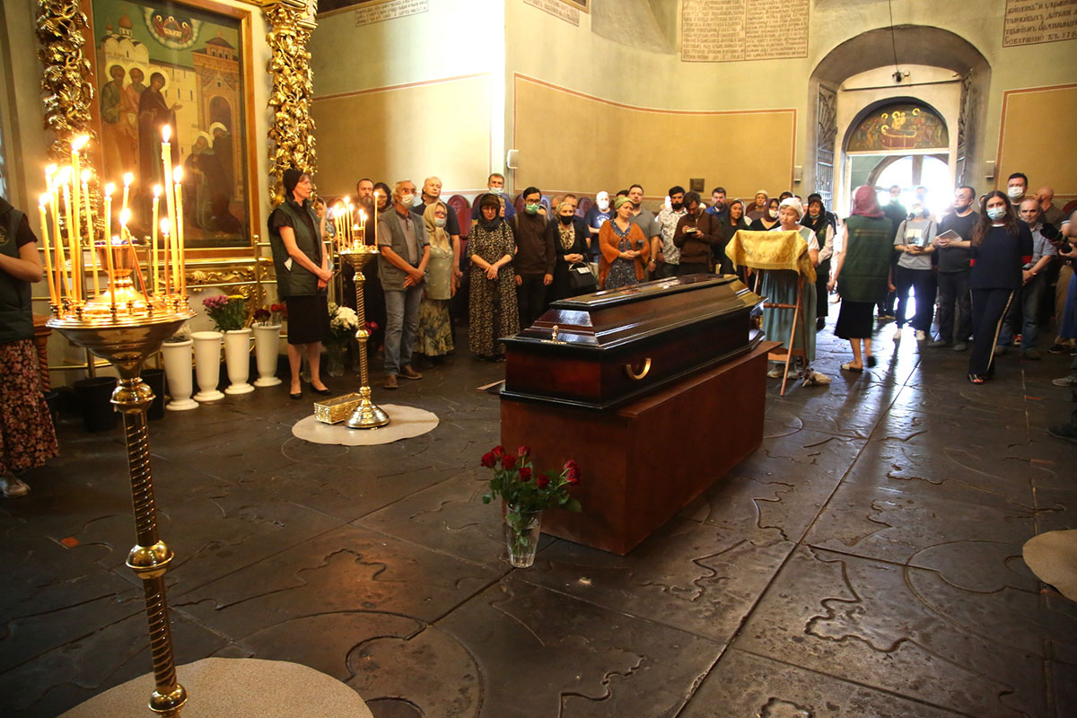 После чина отпевания к гробу выстроилась очередь. Люди подходили и, не боясь эпидемии, целовали крышку домовины,. Правда, распорядитель траурной церемонии то и дело протирал крышку антисептиком.
