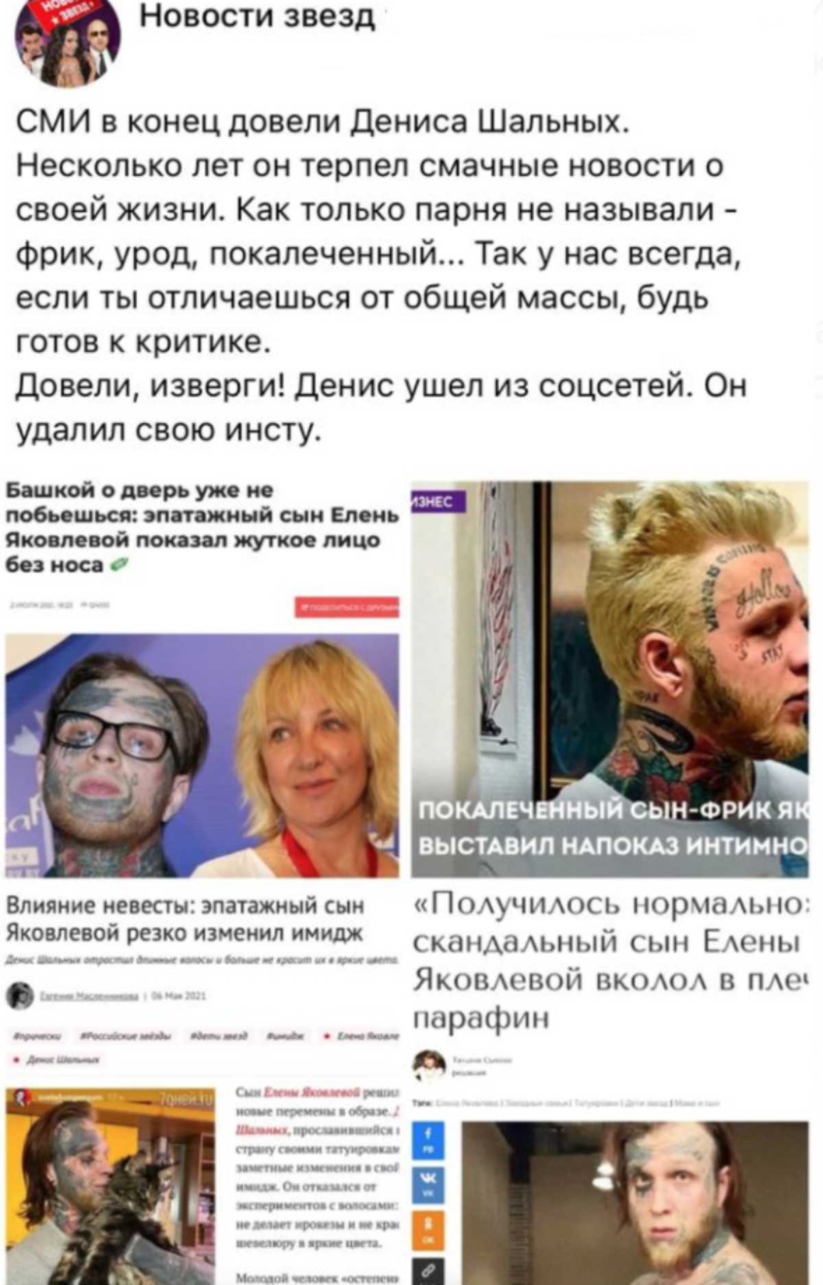 Вначале сын Елены Яковлевой с юмором относился к таким материалам. Затем старался игнорировать. А теперь появилась информация, что Денис Шальных ушел из «Инстаграма**».