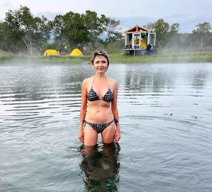 49-летняя актриса съездила на Ходуткинские горячие источники, которые входят в природный парк «Южно-Камчатский» и имеют статус Всемирного наследия ЮНЕСКО. Это самый большой термальный водоток на Камчатке. Он образует парнУю реку с говорящим названием Горячая.
