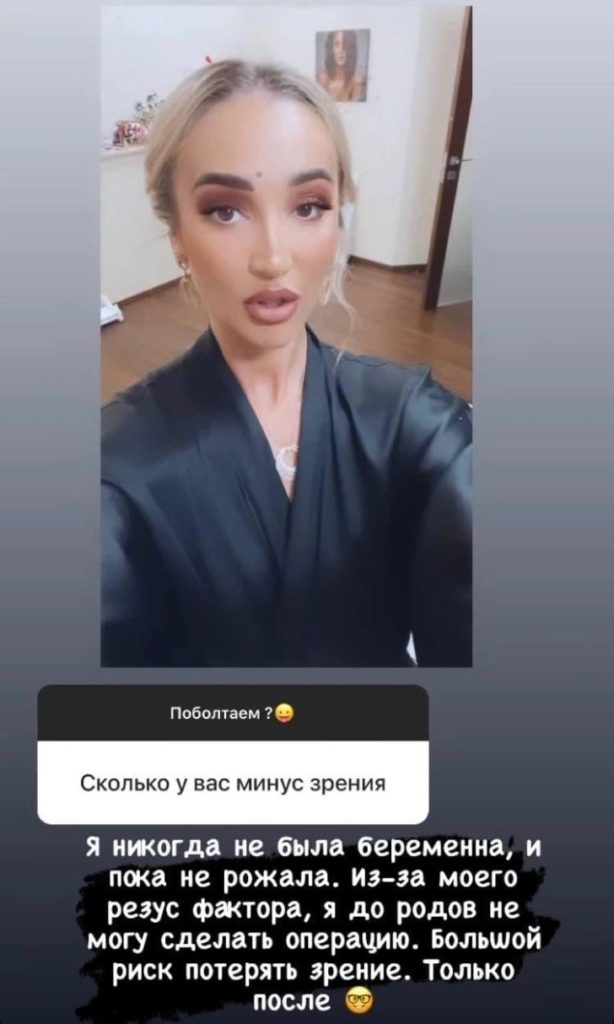«Я никогда не была беременна и никогда не рожала. Из-за моего резус-фактора я до родов не могу сделать операцию. Большой риск потерять зрение. Только после», — объяснила телеведущая в своем микроблоге.