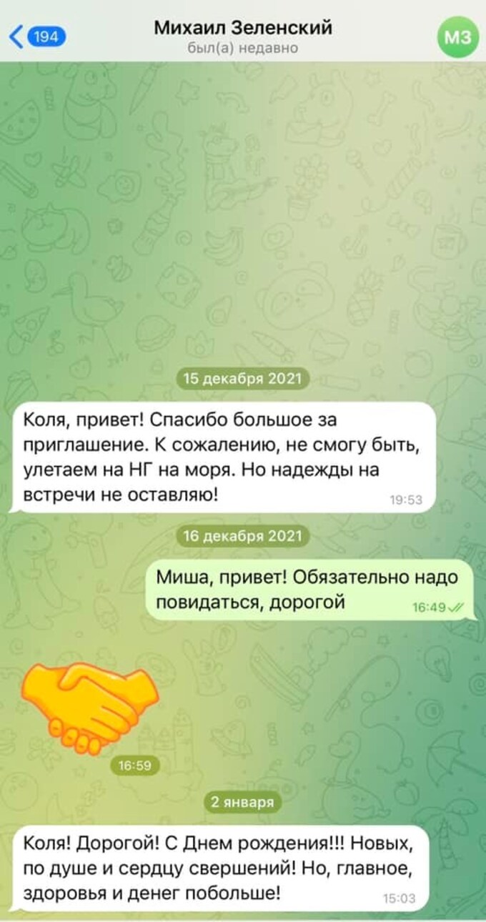 «Коля, спасибо большое за приглашение. К сожалению, не смогу быть — улетаем на Новый год на моря. Но надежды на встречу не оставляю», — писал Зеленский.