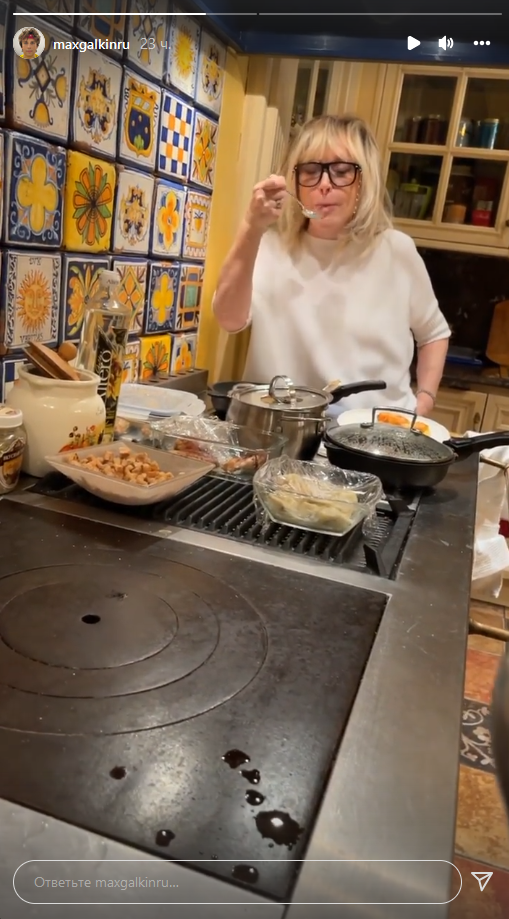 На этот раз Алла Пугачева пожурила мужа за неправильный, по ее мнению, рацион. И пока Галкин хвастался кастрюлей с лососем, приготовленным на пару, артистка за обе щеки уплетала рис и оладьи из картофеля. В белой свободной футболке и с распущенными волосами «женщина, которая поет» однозначно выглядит свежее и моложе, чем во время выходов в свет.