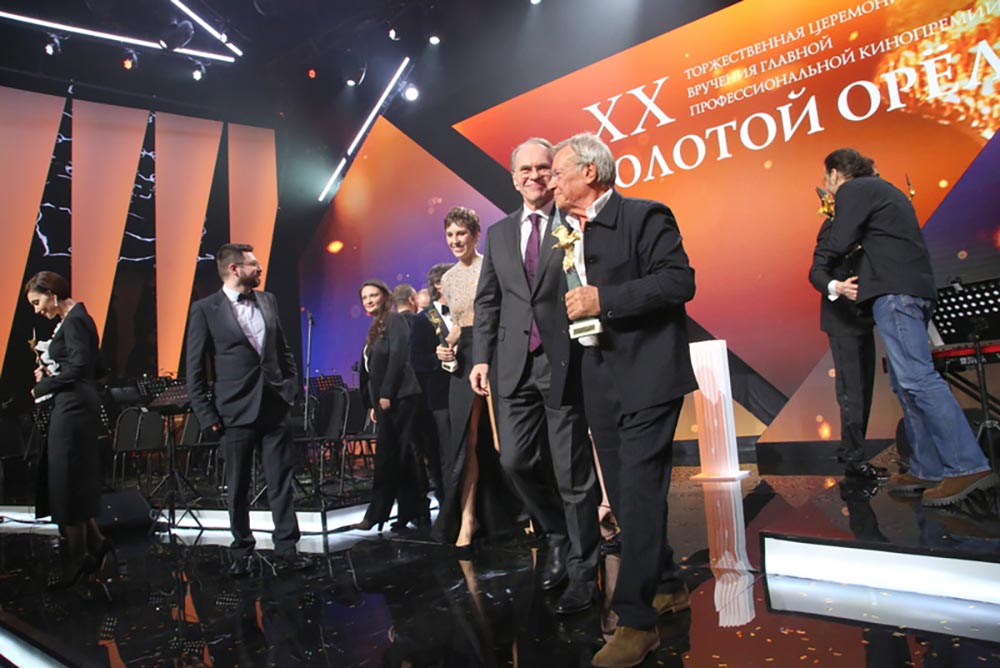 В легендарном первом павильоне киностудии «Мосфильм» прошла юбилейная XX церемония вручения кинопремии «Золотой орел», учрежденной Национальной Академией кинематографических искусств и наук России.