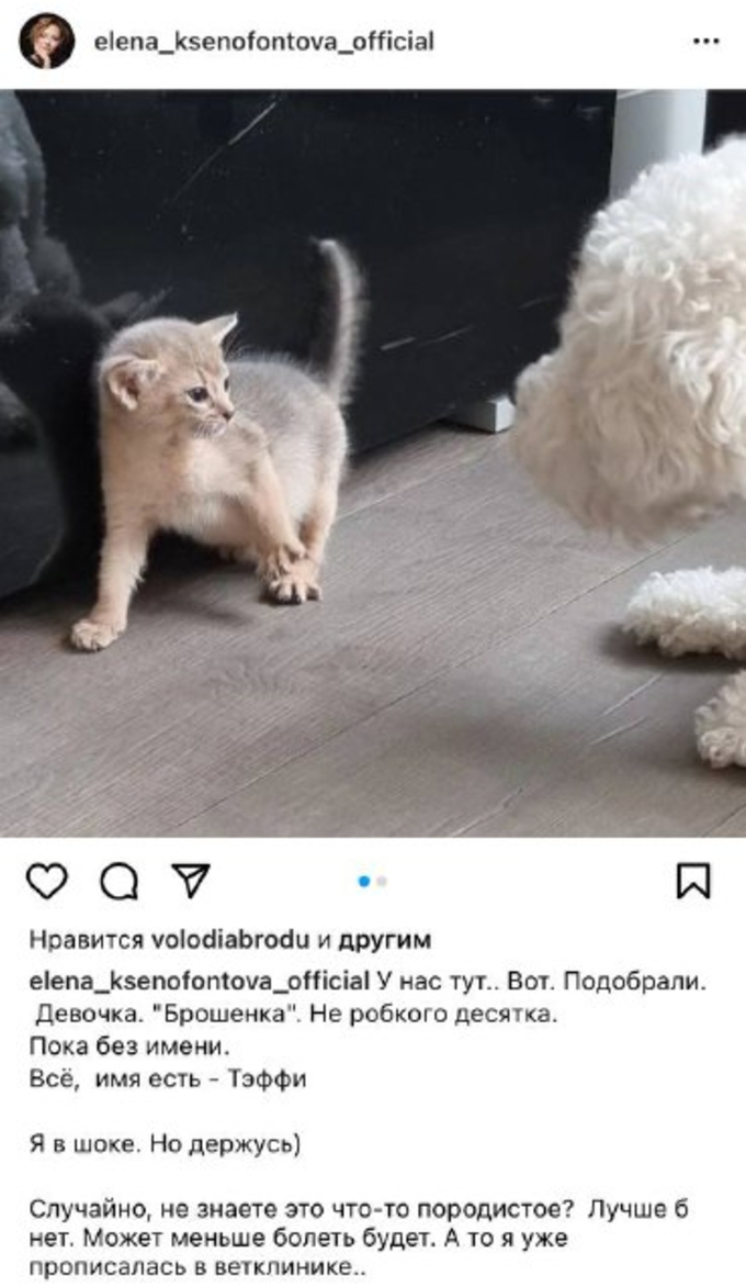 Подписчики блога Елены с восторгом восприняли нового члена семьи звезды. Они не только похвалили актрису за сострадания к «брошенке», но и начали давать ей советы. К примеру, одна из поклонниц Ксенофонтовой заявила, что той необходимо как можно скорее показать Тэффи ветеринару. Впрочем, так как Елена не первый раз имеет дело с животными, до поездки в ветклинику ради обследования котенка она догадалась сама.