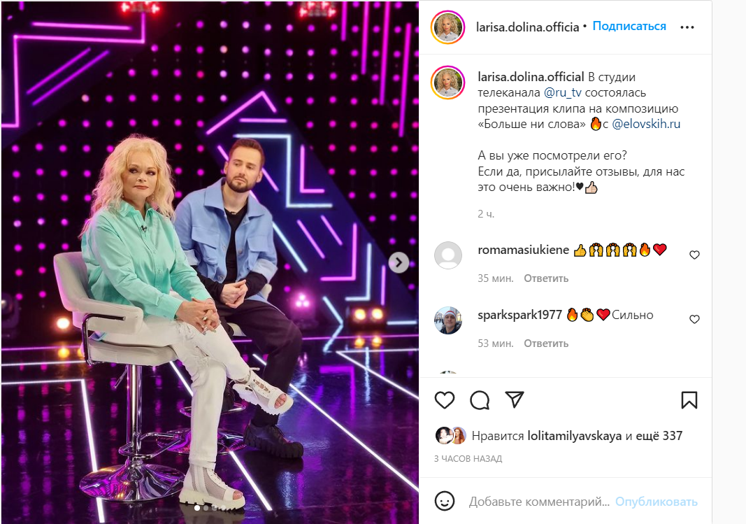 Известная певица Лариса Долина записала дуэт с Александром Еловских. Сегодня, 10 июня, артисты презентовали музыкальное видео на композицию «Больше ни слова». Свое детище знаменитости представили в студии телеканала RU.TV.