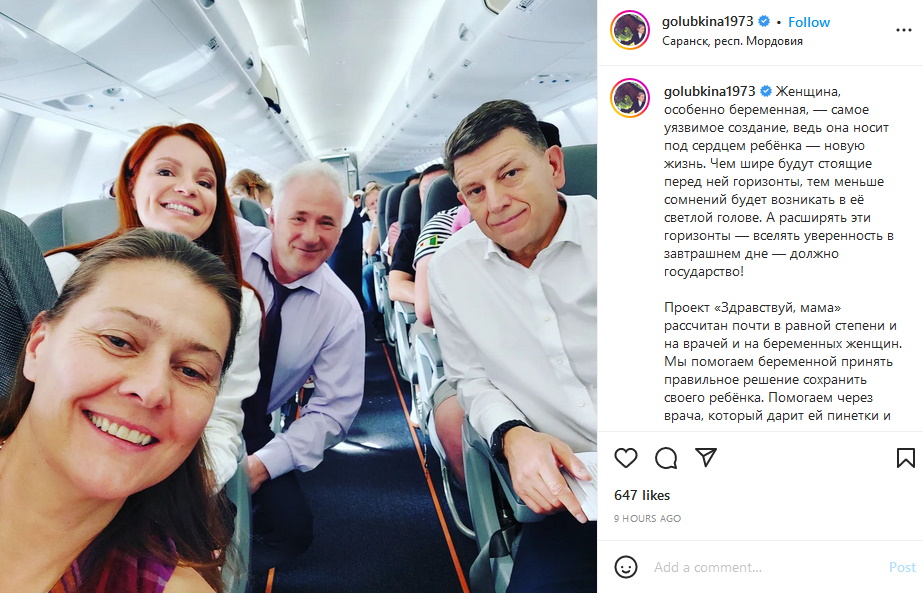 «Женщина, особенно беременная, — самое уязвимое создание, ведь она носит под сердцем ребёнка — новую жизнь. Мы помогаем беременной принять правильное решение сохранить своего ребёнка. Помогаем через врача, который дарит ей пинетки и дневник матери. И после родов - коробку новорожденному», - пояснила Голубкина.