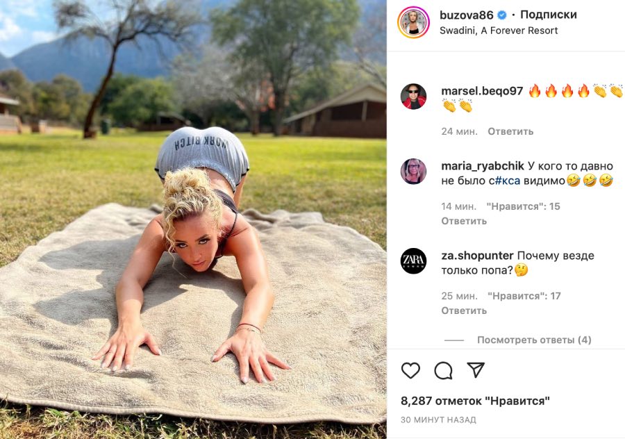 Иногда снимки Бузовой выходят очень провокационными. Телеведущая уже и грудь оголяла, и пышными ягодицами хвасталась. Но фантазия Ольги не иссякает, и на новом фото она предстала в призывной позе. Расстелив коврик прямо на улице, Бузова растянулась на лужайке, оттопырив попу вверх.