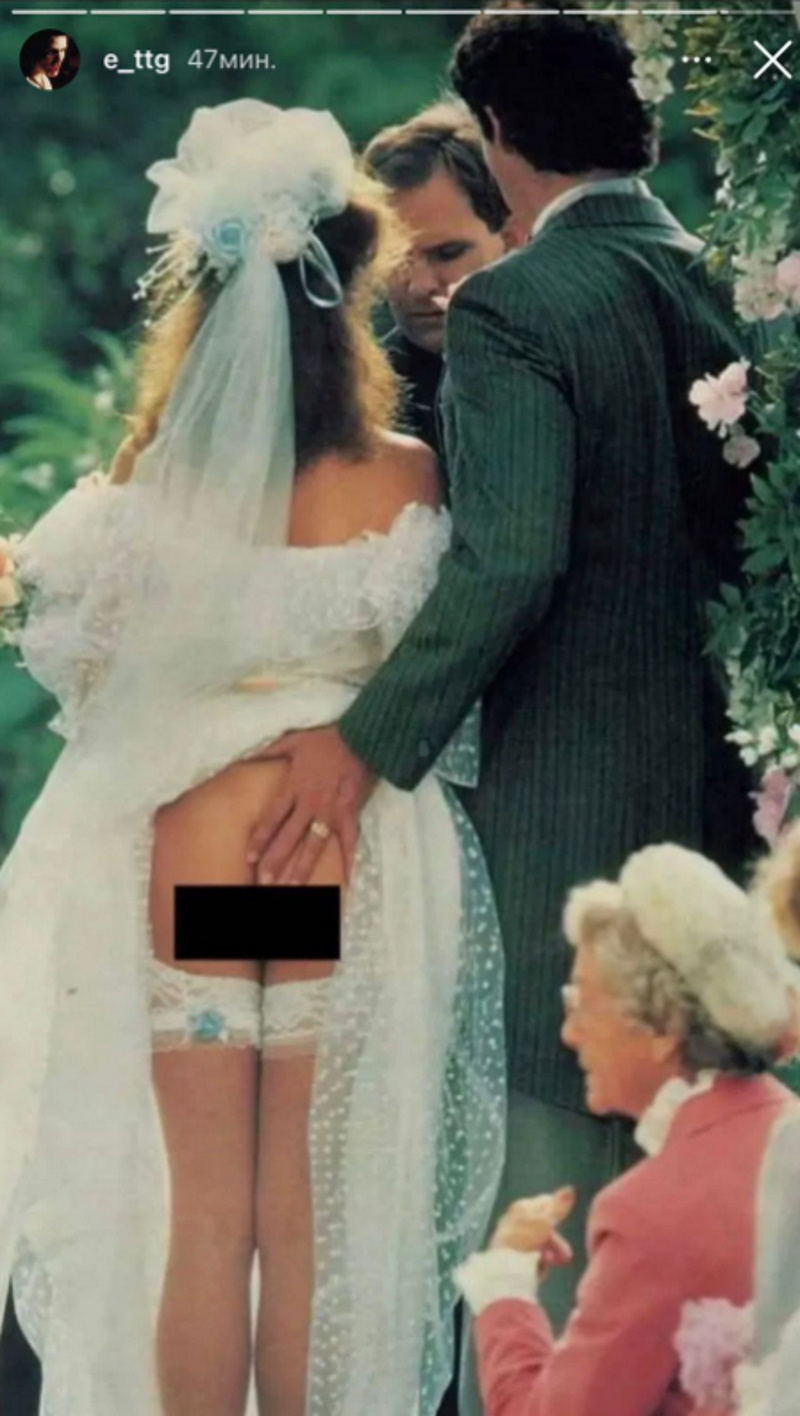 На опубликованном в микроблоге Эрики Кикнадзе снимке запечатлены жених и невеста у алтаря. Чтобы не терять времени зря, нетерпеливый мужчина по-хозяйски положил руку на совершенно голый зад будущей супруги. Помимо аппетитного «крупа» и белых чулочек в кадр попало удивленное лицо пожилой свидетельницы…