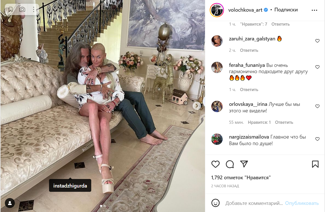 Актер частенько гостит в роскошном загородном доме Волочковой. Сегодня, 19 июля, артист посетил танцовщицу с очередным визитом. В личном микроблоге Анастасия показала фото, на котором позирует в обнимку с приятелем. В кадре Джигурда бесцеремонно трогает пышный бюст разомлевшей от удовольствия подруги. В комментариях звезд назвали идеальной парой.