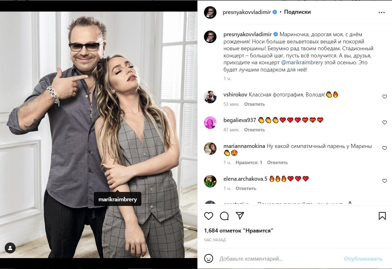 «Мариночка, дорогая моя, с днем рождения! Носи больше вельветовых вещей и покоряй новые вершины! Безумно рад твоим победам», - отметил Владимир Пресняков.