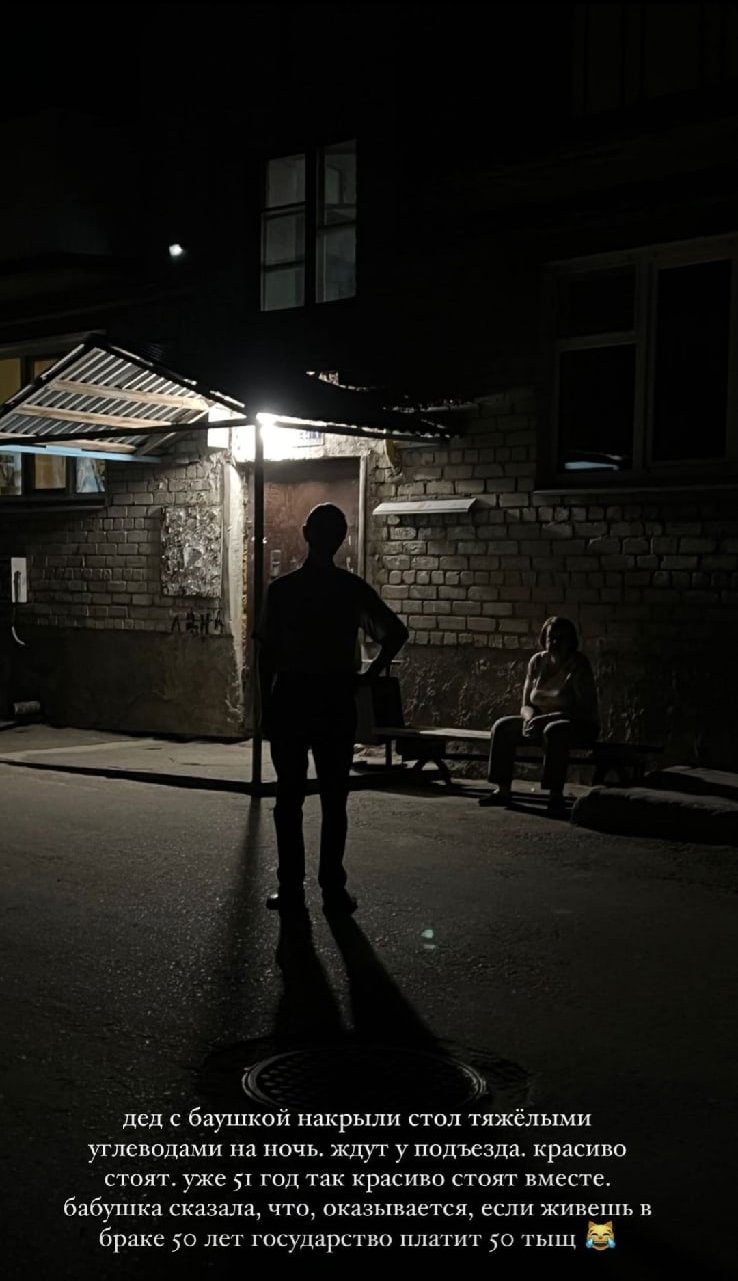 «Дед с бабушкой накрыли стол тяжелыми углеводами на ночь. Ждут у подъезда. Красиво стоят, уже 51 год так красиво стоят вместе», - подписала снимок Софья.