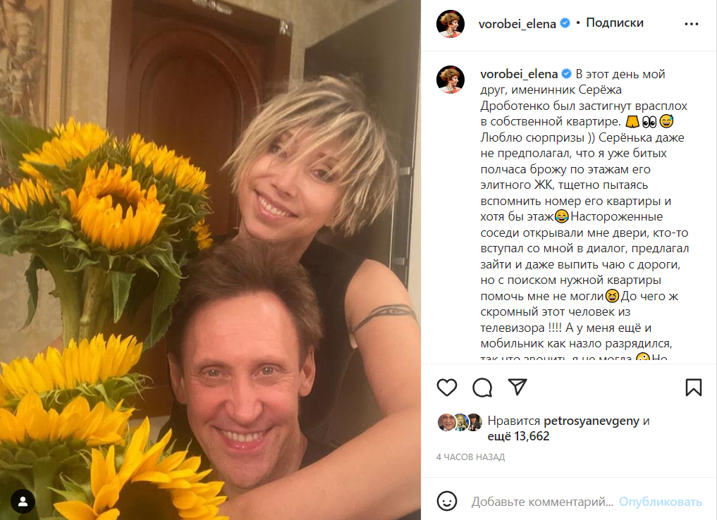 Недавно юморист Сергей Дроботенко отпраздновал день рождения. Звезде «Аншлага» исполнилось 53 года. Комика поздравила артистка Елена Воробей. Коллега приехала домой к Дроботенко с охапкой декоративных подсолнухов.