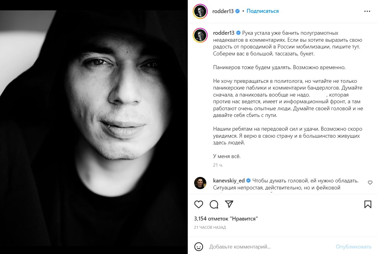 Частичной мобилизации артист посвятил как минимум две публикации и несколько «сториз». Родион пытался шутить, призывал народ не паниковать, но в конце концов не выдержал. Артист устал от сотни комментариев, в которых подписчики в грубой форме не соглашались с ним или даже упрекали в том, что "на Украину он-то точно не отправится".