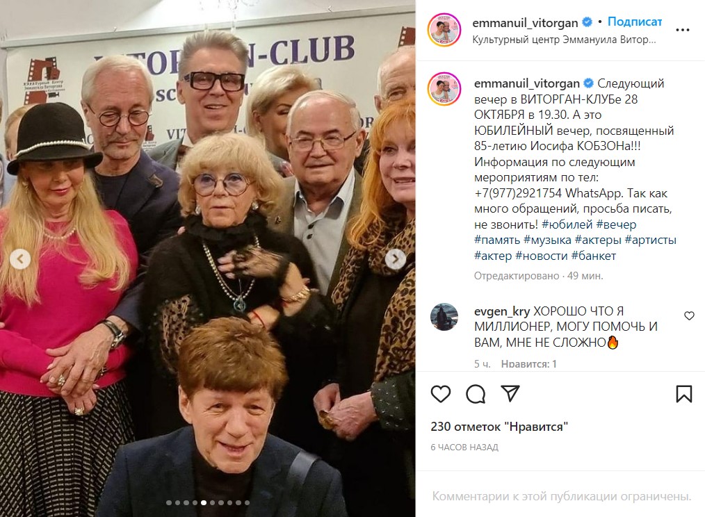 Дама выглядела очень элегантно, однако поразил поклонников вовсе не ее цветущий вид. Снимки с вечера памяти попали в Сеть - их опубликовал в своем микроблоге в «Инстаграме*» Эммануил Виторган, который и организовал мероприятие. На одном из фото неунывающая вдова Кобзона запечатлена в объятиях весьма привлекательного седовласого мужчины. Кавалер нежно обнимает знаменитость за талию и сжимает в руке ее ладонь. Отметим, что им оказался актер Евгений Герасимов.