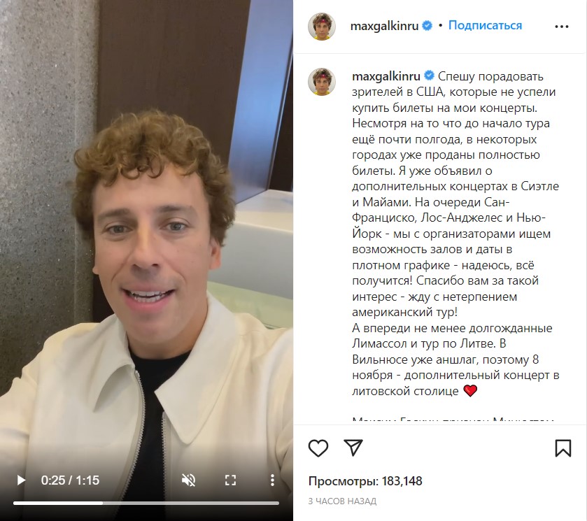 Максим выглядел более чем довольным. «Спешу порадовать зрителей в США, которые не успели купить билеты на мои концерты», - начал он. Артист не без гордости оповестил подписчиков, что в некоторых городах все билеты раскупили практически моментально и пришлось даже искать даты для дополнительных выступлений.