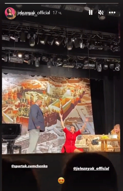 На сей раз артистка показала в своем микроблоге в соцсети эмоциональный фрагмент со спектакля. В нем Железняк играла с мужем. В какой-то момент Олеся, облаченная в красное платье, падает на колени перед Спартаком Сумченко.