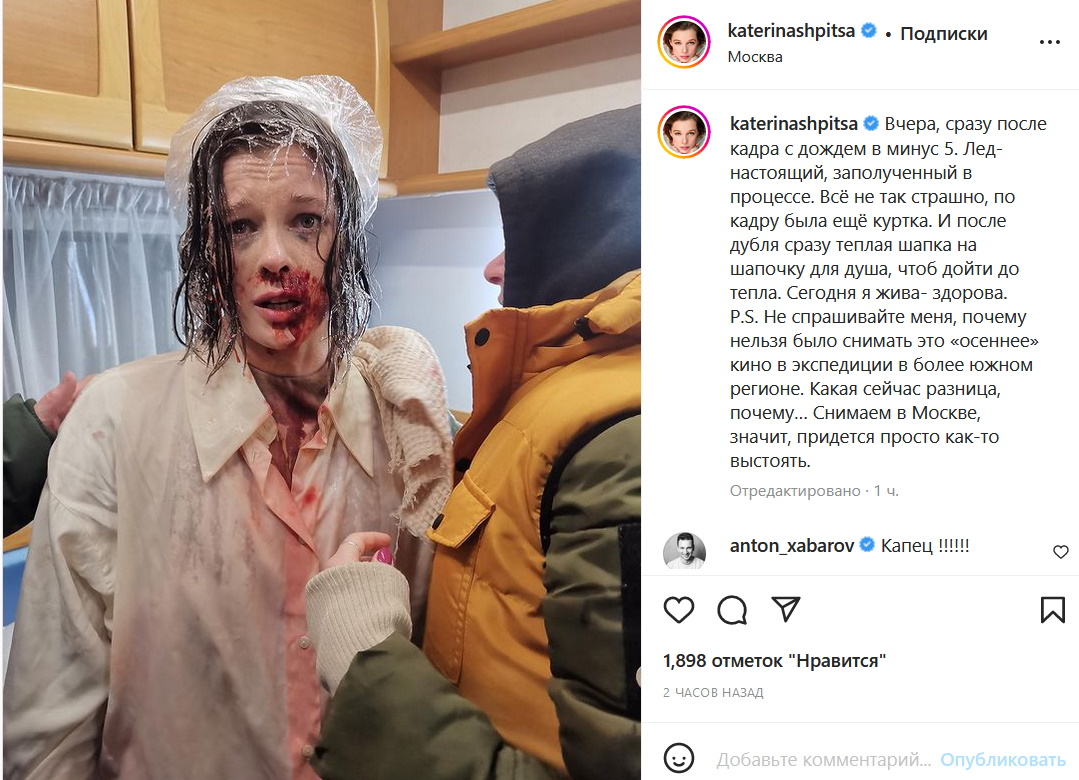 «Вчера, сразу после кадра с дождем в минус 5. Лед - настоящий, заполученный в процессе. Все не так страшно, по кадру была еще куртка. И после дубля сразу теплая шапка на шапочку для душа, чтоб дойти до тепла. Сегодня я жива-здорова. P.S. Не спрашивайте меня, почему нельзя было снимать это «осеннее» кино в экспедиции в более южном регионе. Какая сейчас разница, почему… Снимаем в Москве, значит, придется просто как-то выстоять (орфография и пунктуация автора сохранены. - Прим.ред.)», - призналась несгибаемая героиня.