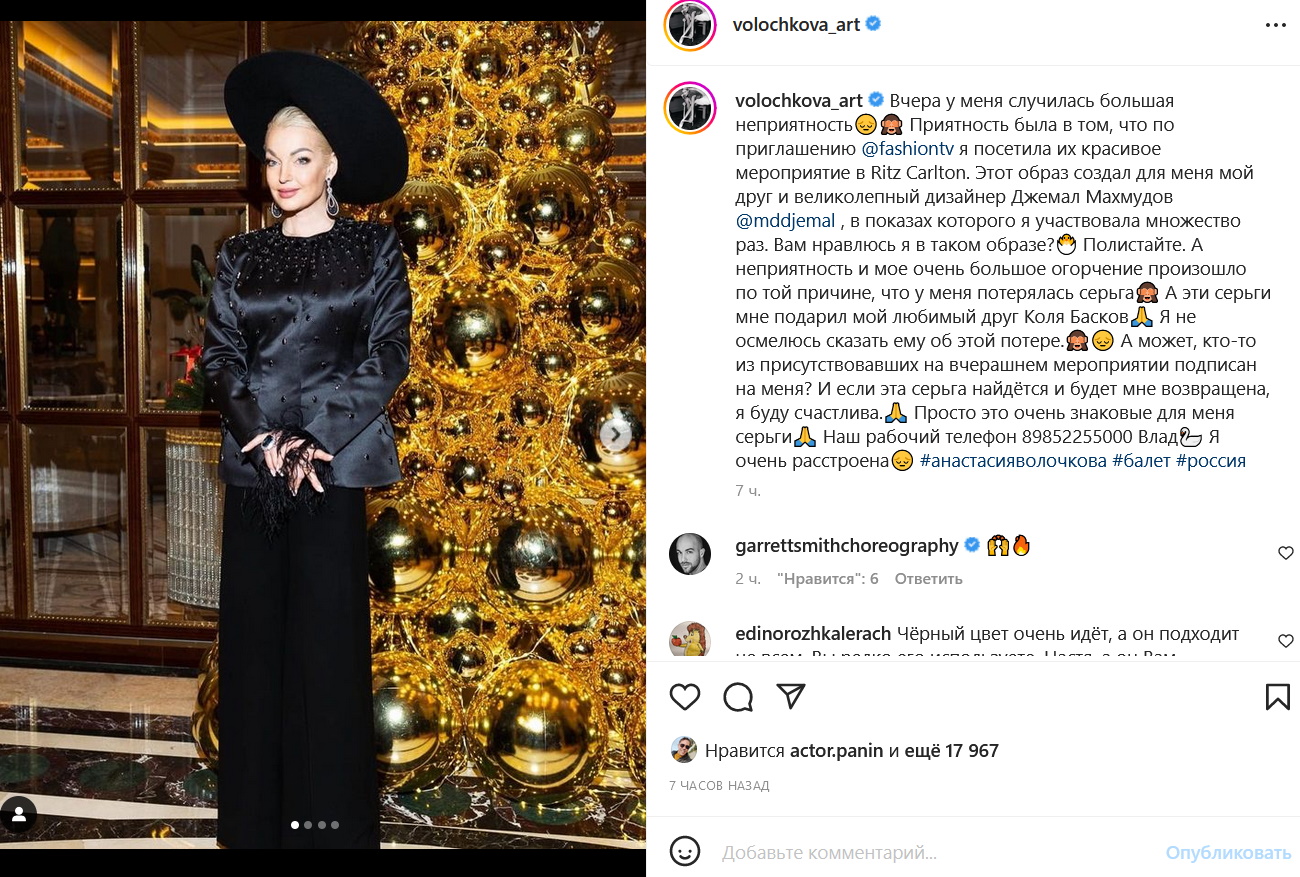 «А неприятность и мое очень большое огорчение произошло по той причине, что у меня потерялась серьга. А эти серьги мне подарил мой любимый друг Коля Басков. Я не осмелюсь сказать ему об этой потере. А может, кто-то из присутствовавших на вчерашнем мероприятии подписан на меня? И если эта серьга найдется и будет мне возвращена, я буду счастлива. Просто это очень знаковые для меня серьги», — обратилась Волочкова ко всем неравнодушным к ее горю.