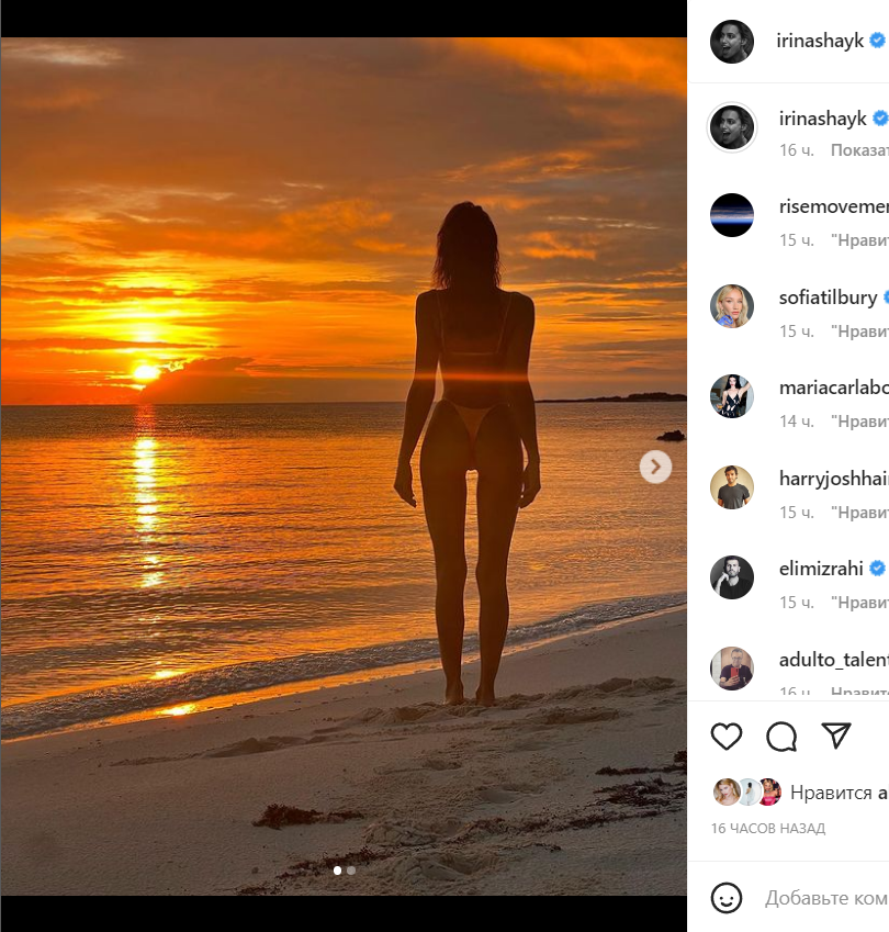 Накануне американцы готовились встретить главный праздник – католическое Рождество. Жители США накрывали столы, упаковывали подарки и наряжали елки. Ирина же, судя по всему, провела сочельник на пляже где-то в теплых краях. В личном микроблоге Шейк позирует на фоне живописного заката. На фото влажная после купания модель стоит спиной к камере, немного оттопырив попу в стрингах. Знаменитость демонстрирует миру стройные ноги и заветный бугорок между ног.