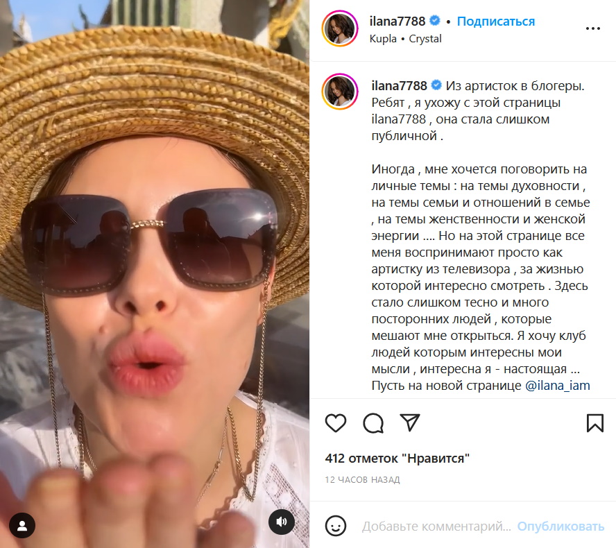 «Из артисток в блогеры. Ребят, я ухожу с этой страницы ilana7788, она стала слишком публичной. Иногда, мне хочется поговорить на личные темы : на темы духовности , на темы семьи и отношений в семье , на темы женственности и женской энергии … Но на этой странице все меня воспринимают просто как артистку из телевизора, за жизнью которой интересно смотреть», - посетовала Юрьева.