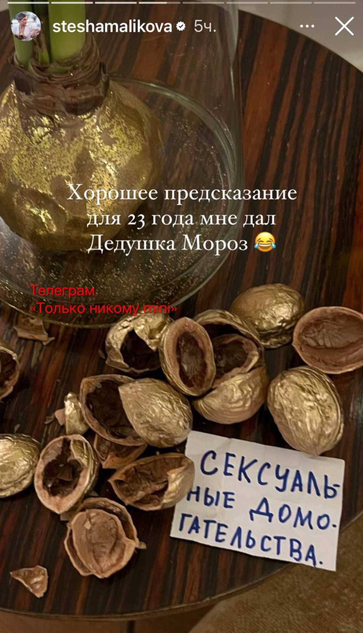 Пока многочисленные поклонники рассыпались в комплиментах Маликову, который считается образцовым семьянином, поддала огня его дочь Стефания. В своем аккаунте в «Телеграме» наследница композитора опубликовала фотографию, на которой на фоне позолоченной скорлупы грецких орехов расположила бумажку с загадочной надписью: «сексуальные домогательства».