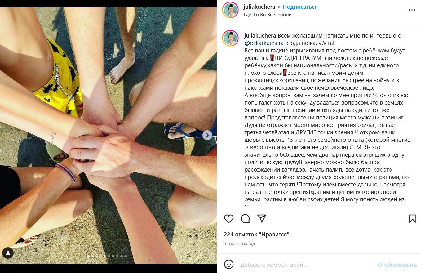 Как бы там ни было, после появления в студии блогера-миллонника в адрес Оскара Кучеру стали поступать угрозы. Оскорбительные сообщения от возмущенных хейтеров получила также супруга шоумена Юлия. Женщина находится в подавленном состоянии из-за открытой ненависти некоторых граждан. Удивительно, но жена решила не вставать на сторону любимого мужчины. В своем микроблоге брюнетка честно заявила, что не разделяет патриотическую позицию оскандалившегося супруга. На публикацию Юлии Кучеры обратили пристальное внимание не только критики, но и поклонники журналиста. Так, последние даже посчитали, что жена отвернулась от убежденного патриота.