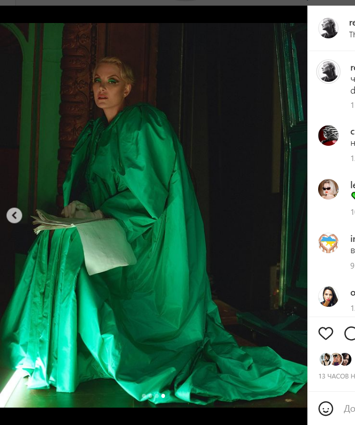 Теперь в соцсетях знаменитая блондинка публикует фото, созданные в процессе работы над «Кактусом». Так, фотограф нашел Ренату Муратовну за кулисами. Камера запечатлела, как облаченная во все зеленое Литвинова с приоткрытым ртом сидит в уголке и, видимо, разучивает текст.