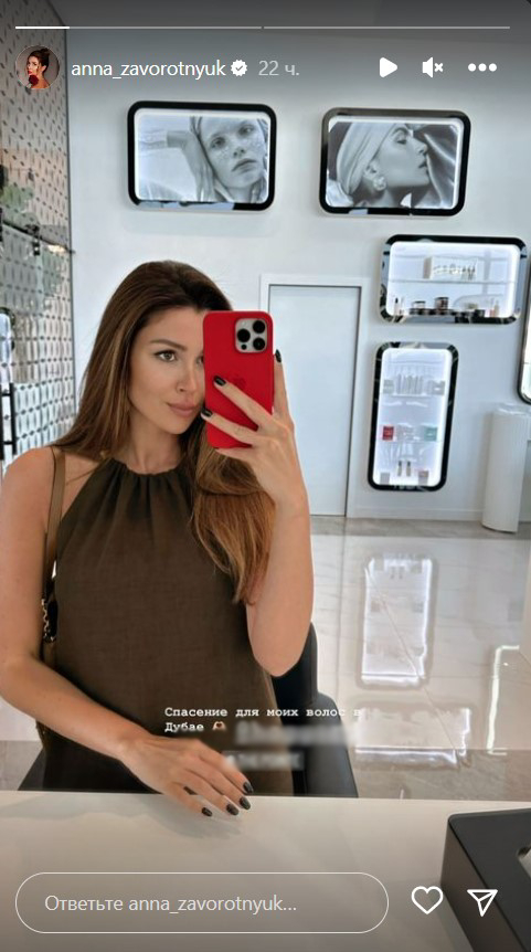 На фото модель запечатлела себя в зеркале в одном из элитных салонов красоты. На длинноволосой красавице было надето легкое коричневое платье свободное кроя. Свободной рукой Анна будто бы инстинктивно прикрыла зону живота.