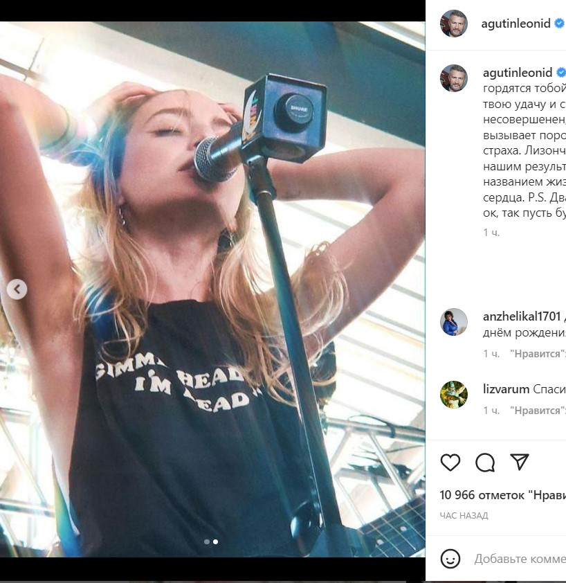 "Вот уже 24 года родители любят тебя, гордятся тобой и верят в твою звезду. Это значит, верят в твою удачу и счастье, добытое в борьбе. То, что мир несовершенен, даже интересно, а то, что коварен и жесток, вызывает порой удушливое ощущение несправедливости и страха. Лизончик, ты красивый человек. Я более чем доволен нашим результатом. Желаю тебе победы в этой битве под названием жизнь. Желаю счастья от всего своего папиного сердца. P.S. Два раза использовал в тексте слово счастье. Ну ок, так пусть будет двойной пакет", - обратился к наследнице Агутин.