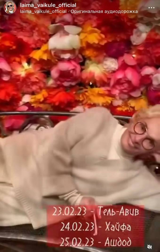Вайкуле опубликовала ролик, в котором анонсировала выступления в Тель-Авиве, Хайфе и Ашдоде. Причем во время съемки Лайма Станиславовна вальяжно разлеглась среди цветов. Похоже, что певица не сильно переживает из-за всего происходящего.