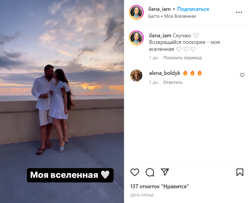 «Скучаю. Возвращайся поскорее – моя вселенная», – подписала публикацию Илана. При этом Юрьева не уточнила, куда отправился ее возлюбленный. Можно предположить, что избранник юмористки уехал по рабочим делам.