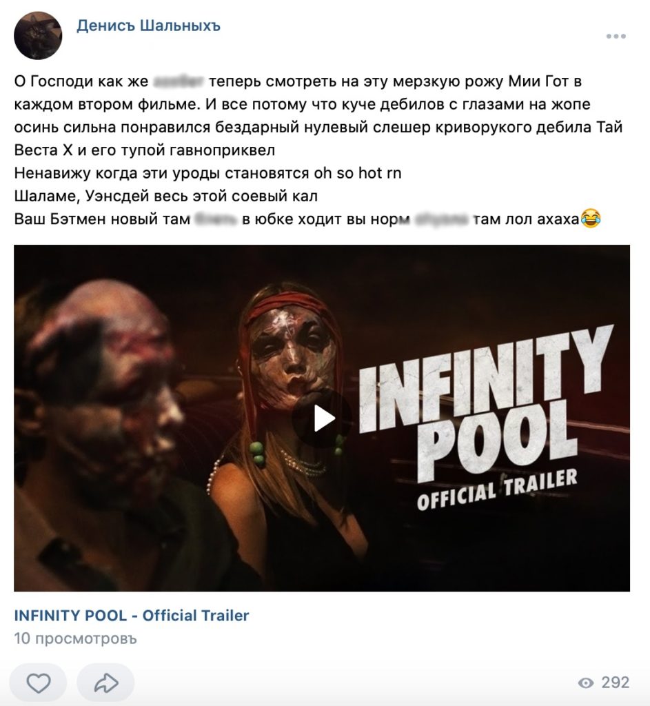 «О Господи как же ***** теперь смотреть на эту мерзкую рожу Мии Гот в каждом втором фильме. И все потому что куче дебилов с глазами на жопе осинь сильна понравился бездарный нулевый слешер криворукого дебила Тай Веста X и его тупой гавноприквел. Ненавижу когда эти уроды становятся oh so hot rn Шаламе, Уэнсдей весь этой соевый кал Ваш Бэтмен новый там ***** в юбке ходит вы норм ****** там лол ахаха», — написал на своей странице в соцсети Денис (орфография и пунктуация автора сохранены. - прим.ред.).