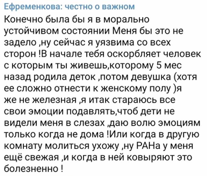 Спустя несколько недель Юлия все еще не может прийти в себя от горя. Возможно, именно поэтому звезда «Дома-2» так остро реагирует на все происходящее. На днях Ефременкова дала понять, что ее жених Мондезир Свет-Амур опустился до оскорблений в ее адрес. Кроме того, экс-участник скандального реалити начал учить Юлию, как ей правильно скорбеть по названной маме. Добила Ефременкову подписчица в Instagram*, которая тоже начала советовать, как ей жить.