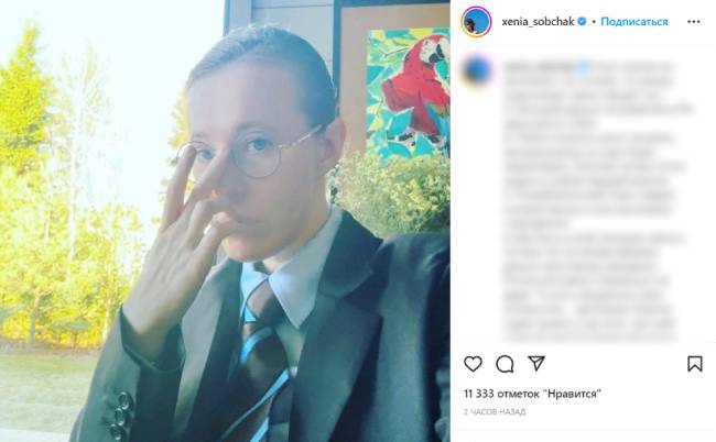 Однако многие фолловеры большее внимание обратили на внешность звезды экрана, чем на ее рекомендации. Ксения предстала в мужском деловом костюме, с галстуком, в очках, без косметики и с зализанной прической – с первого взгляда кажется, что светская львица без волос. Ее просто не узнать.
