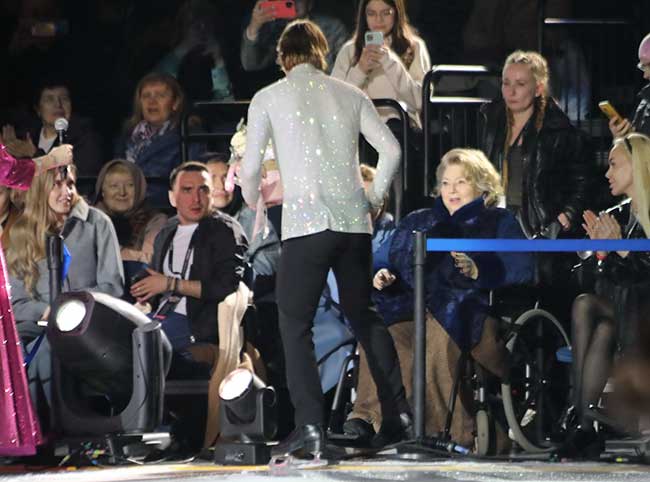 Отметилась на шоу тренер Татьяна Тарасова. Она заняла почетное место в первом ряду. Поприветствовал ее Евгений Плющенко эффектно, встав перед ней на одно колено.