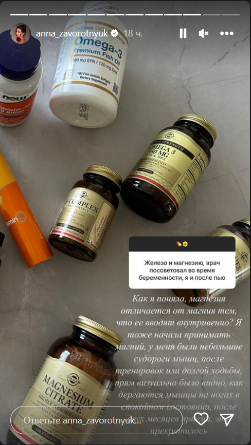 «Пью рыбий жир, витамины группы В, магний и витамин С», — поделилась Анна. Также Заворотнюк сообщила, что употребляет капсулы с пробиотиками, омега-3, омега-6 и собирается в ближайшее время начать прием витамина D на постоянной основе.