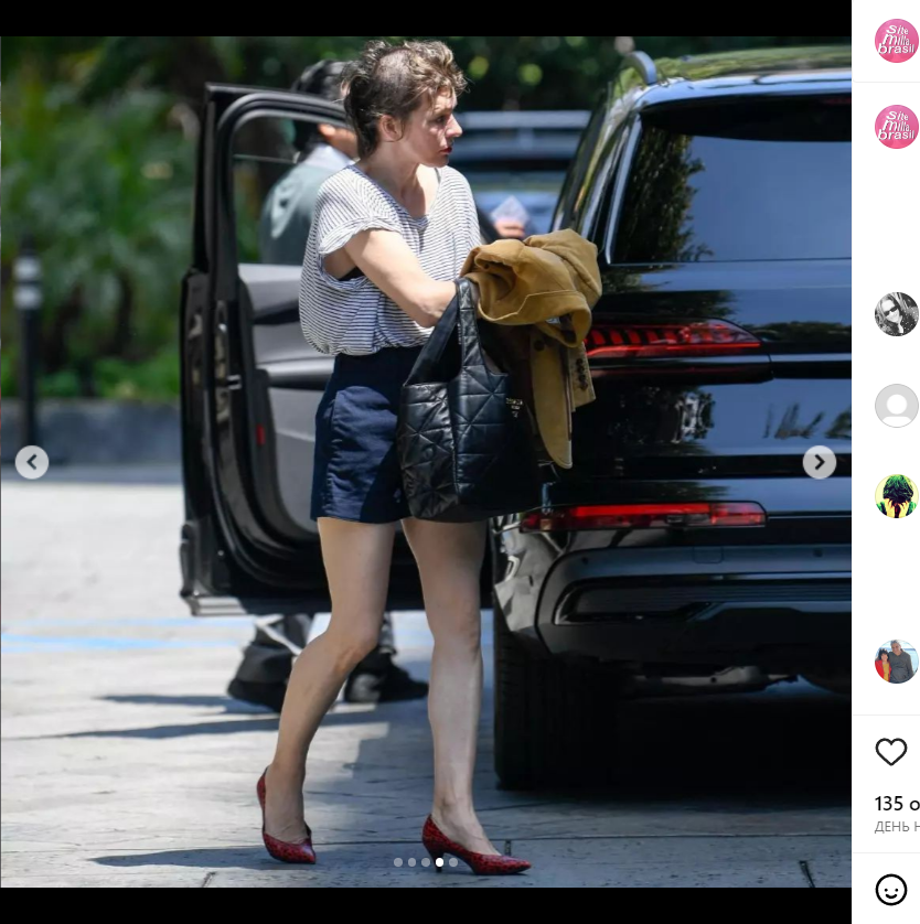 Папарацци запечатлел Миллу Йовович, когда она выходила из машины. Знаменитость была облачена в коротенькие шорты с высокой талией синего цвета и футболку в полосочку. Образ звезда «Пятого элемента» дополнила черной сумкой и красными лодочками. Между тем прическа знаменитости выглядела, мягко говоря, странно. Часть головы Миллы была словно выбрита. Оставшиеся волосы между тем были спутаны в колтуны.