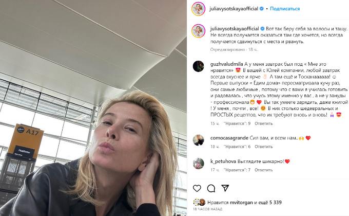 «А мы тебя, Юлечка, любим и обожаем! Не обращай внимания на идиотов…, у них своя «ниша»; «Замечательно сказано»; «Юля, вы лучшая! Обожаем вас»; «Можно рецепт горелых драников?»; «В Лондон?» — обратились люди к Высоцкой.