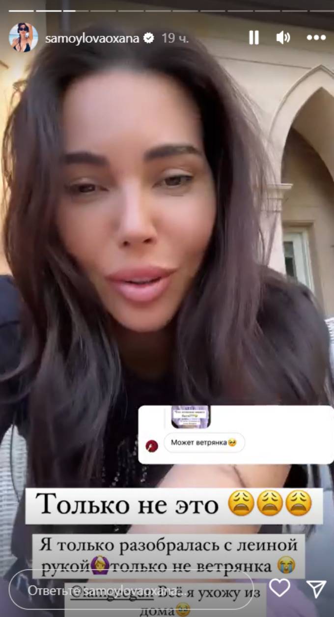 «Только не это. Я только разобралась с Леиной рукой, только не ветрянка. Джиган, все, я ухожу из дома. Давида сегодня черепашка наша еще укусила. И у меня пятичасовое собрание, не вставая с кресла. Кажется, я хочу исчезнуть, и чтобы все как-нибудь без меня рассосалось», — заявила Оксана Самойлова.