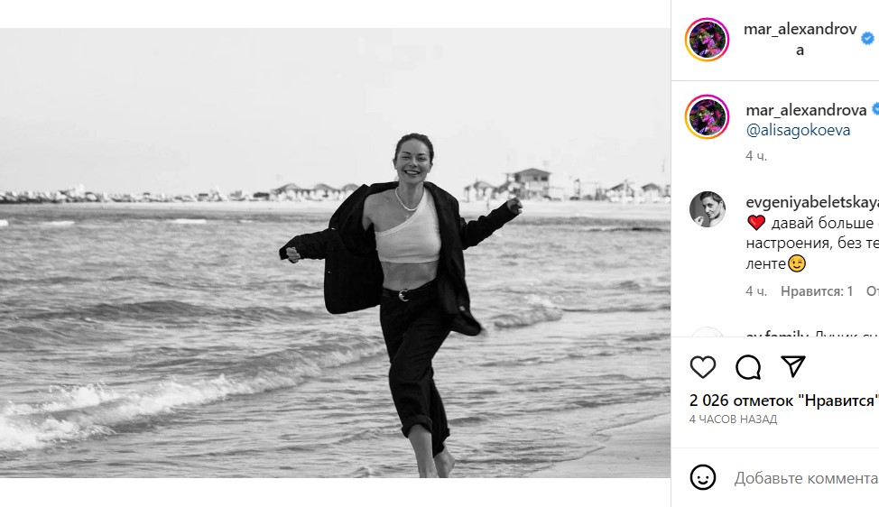 Любимица публики Марина Александрова личную жизнь выставлять напоказ не любит. Звезду практически никогда не замечали в грязных скандалах, она не ходит по ток-шоу и старается не обсуждать свою личную жизнь на публике. Поэтому фанатам остается довольствоваться только тем, что показывает знаменитость в личном микроблоге в «Инстаграме*».