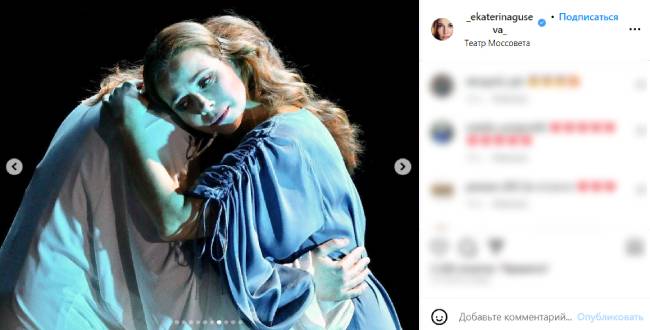 В личном микроблоге знаменитость опубликовала подборку кадров, на одном из которых обнимается с мужчиной. Впрочем, ничего интимного в этих объятиях, как выяснилось, не было. Екатерина Гусева объяснила, что это ее партнер по спектаклю Евгений Вальц.