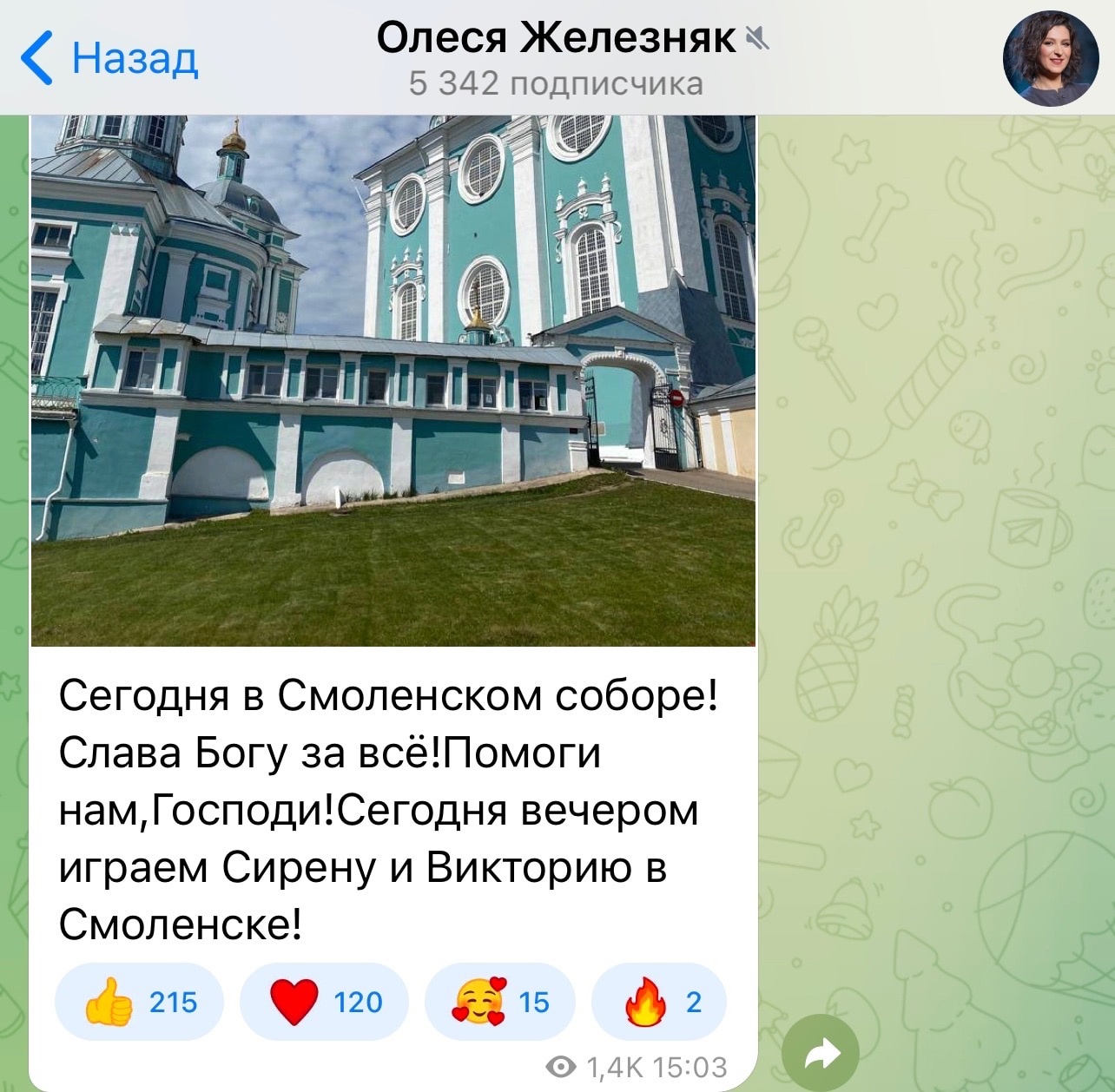 Железняк сообщила, что сейчас находится в Смоленске со спектаклем «Сирена и Виктория». В свободное от сцены время знаменитость успела посетить местные достопримечательности, о чем эмоционально рассказала фолловерам.