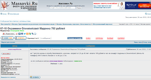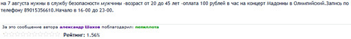«На 7 августа нужны в службу безопасности мужчины - возраст от 20 до 45 лет - оплата 100 рублей в час на концерт Мадонны в Олимпийский. Начало в 16-00 до 23-00»